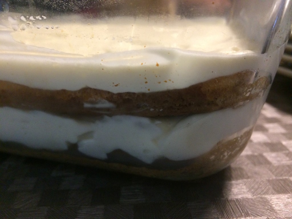 - When the first layer of ladyfingers is done, add half of the tiramisu cream