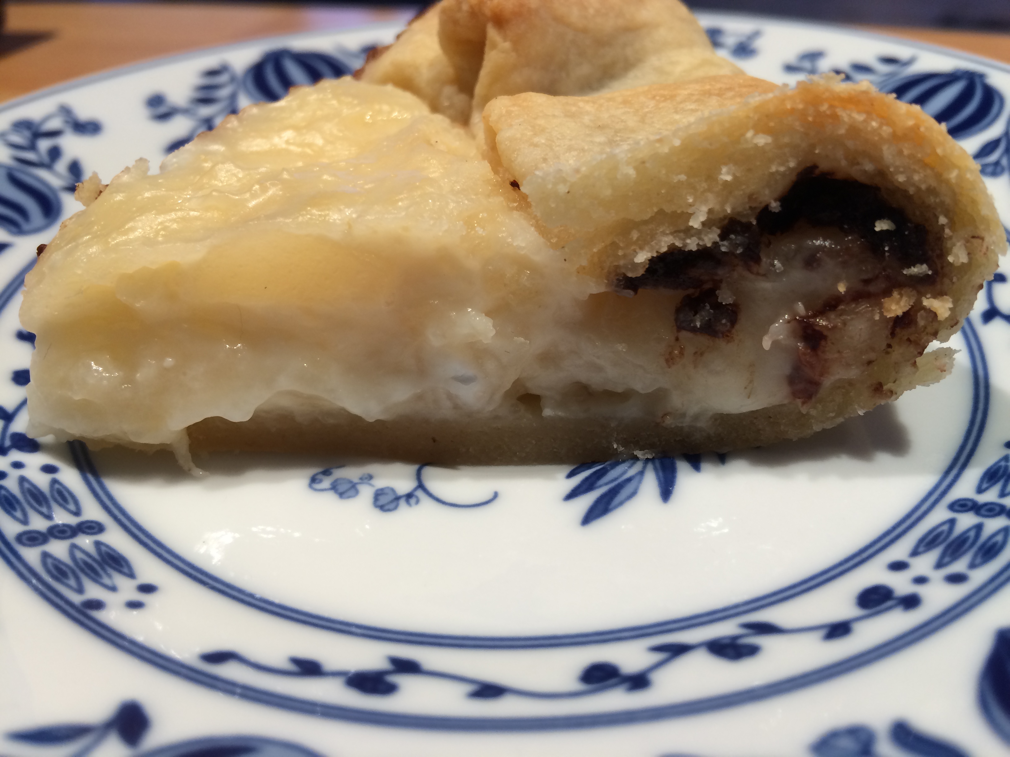 Rye sourdough tart with ham, gorgonzola and pear filling