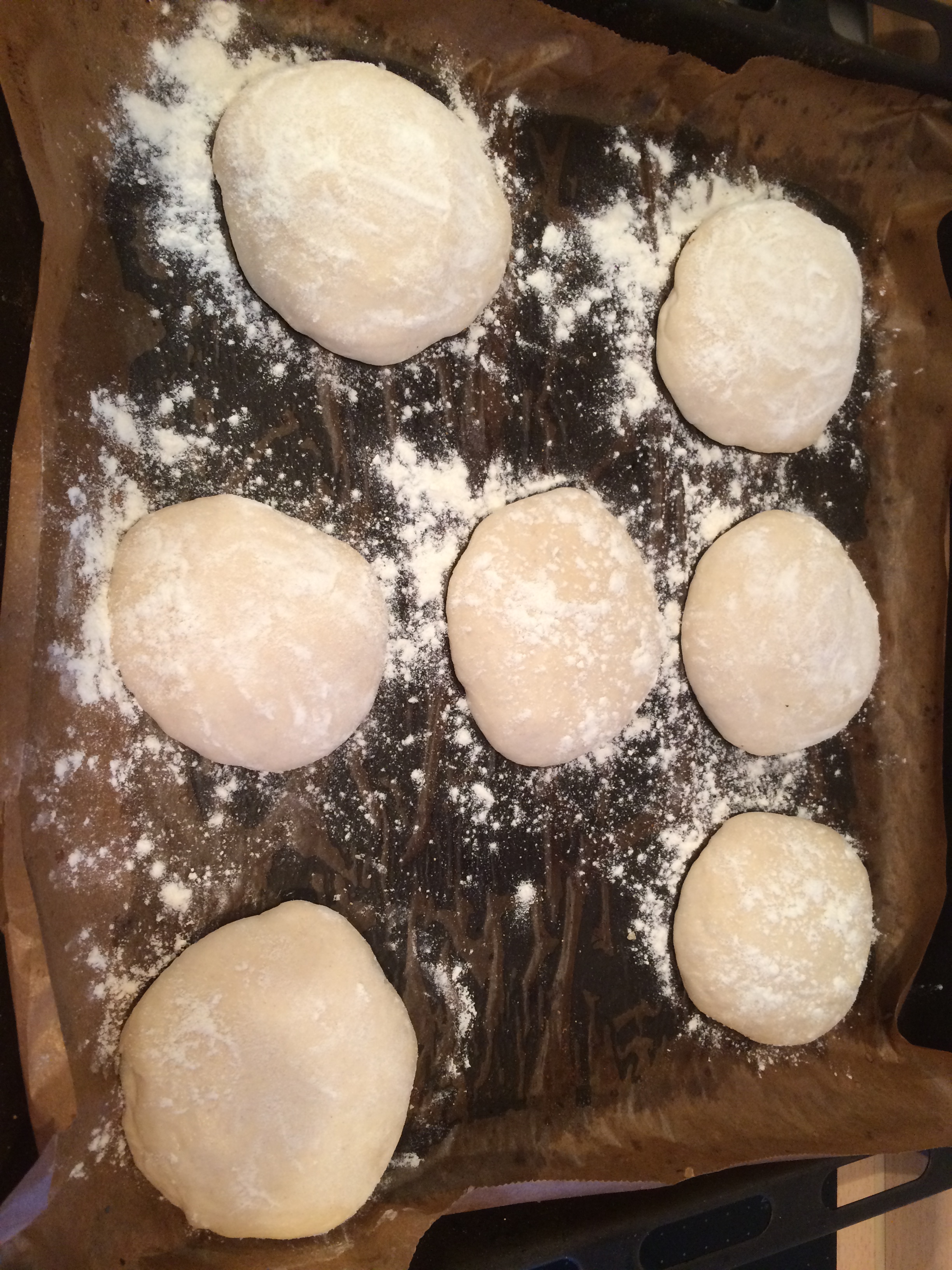 - Flour the balls slightly and spread the flour all around (while they still remain on the surface – do not move them)