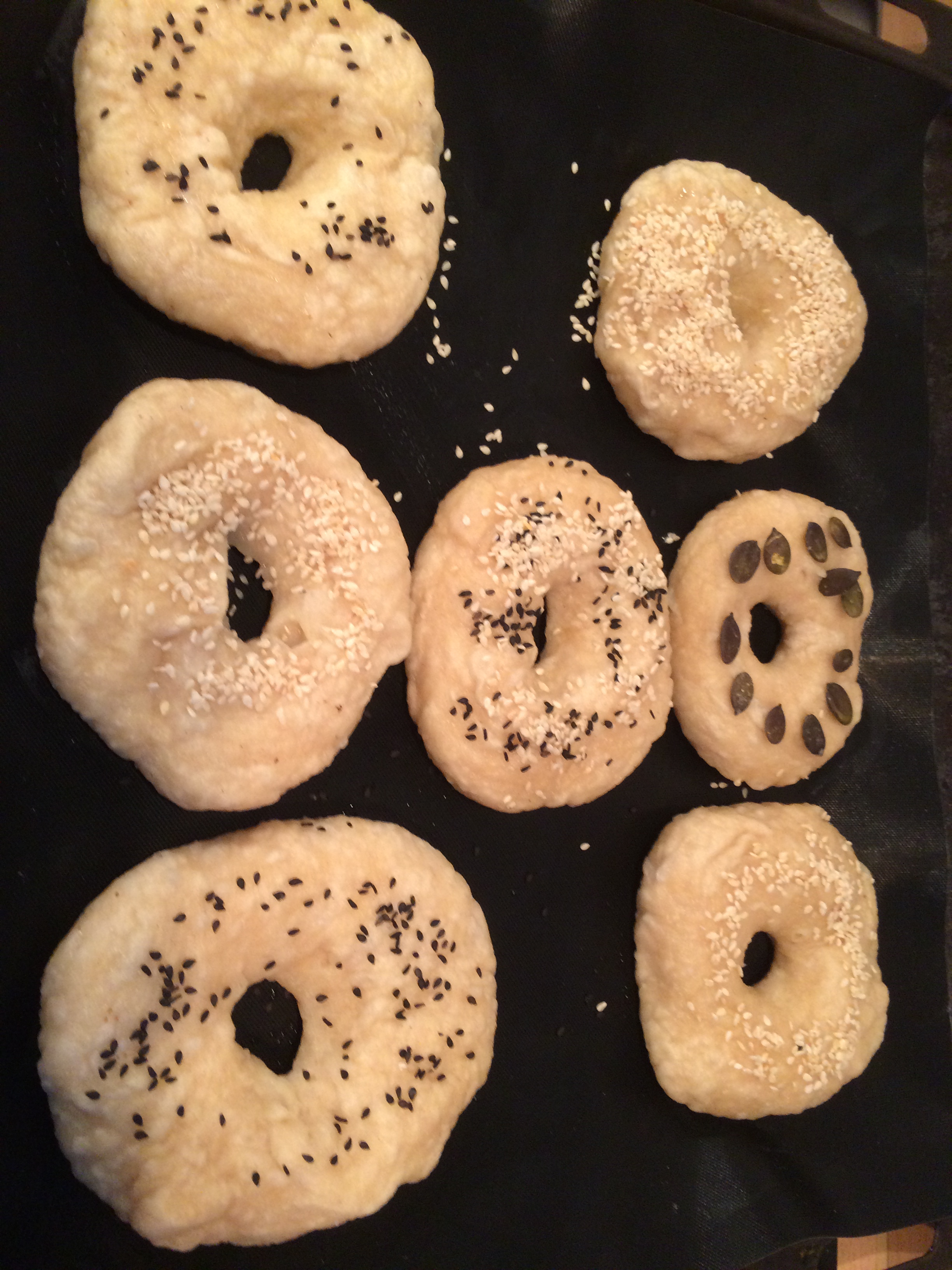 - Each time that you add a bagel in the strainer, you can move the previous one in the baking pan that you are going to bake them