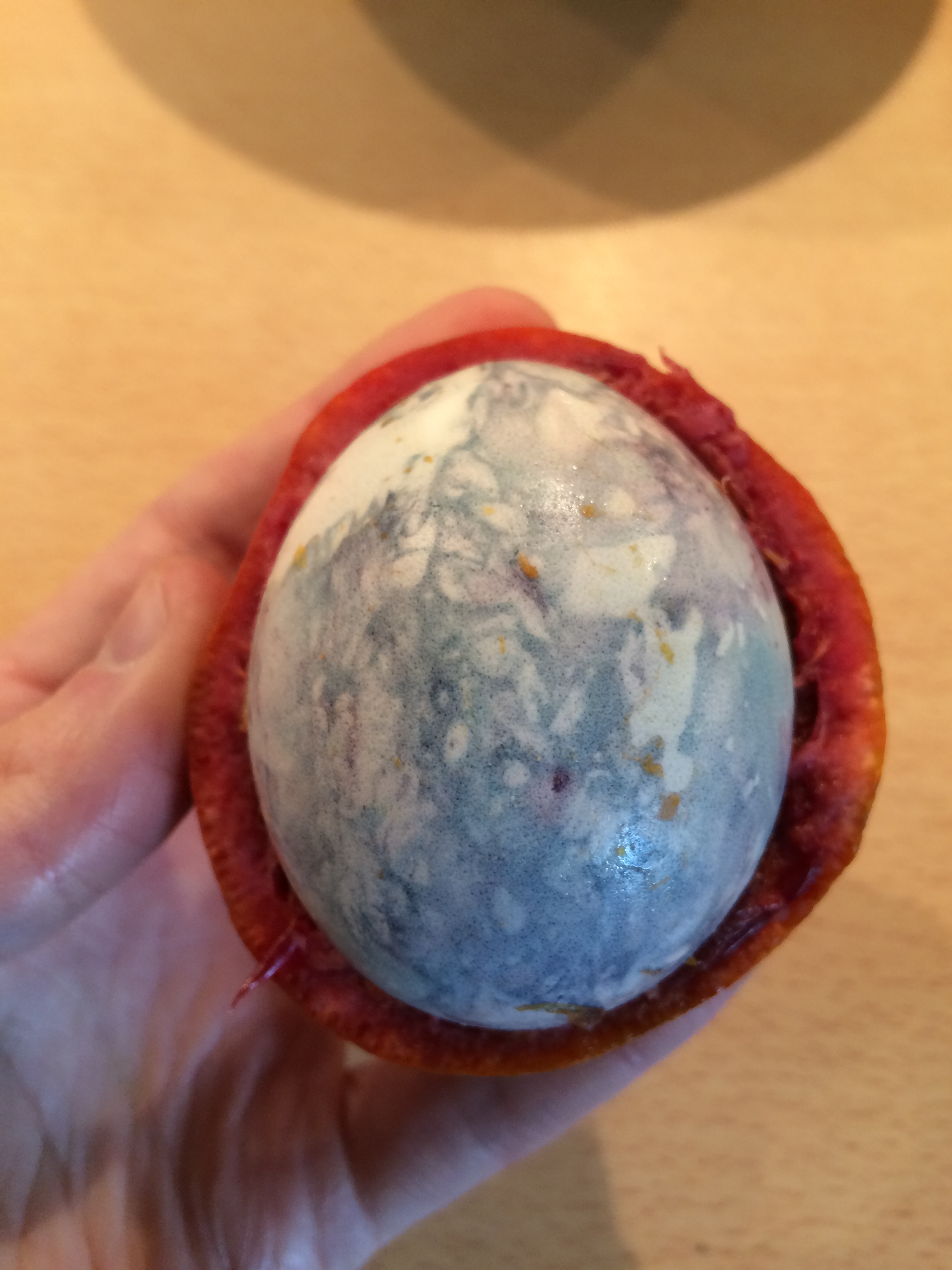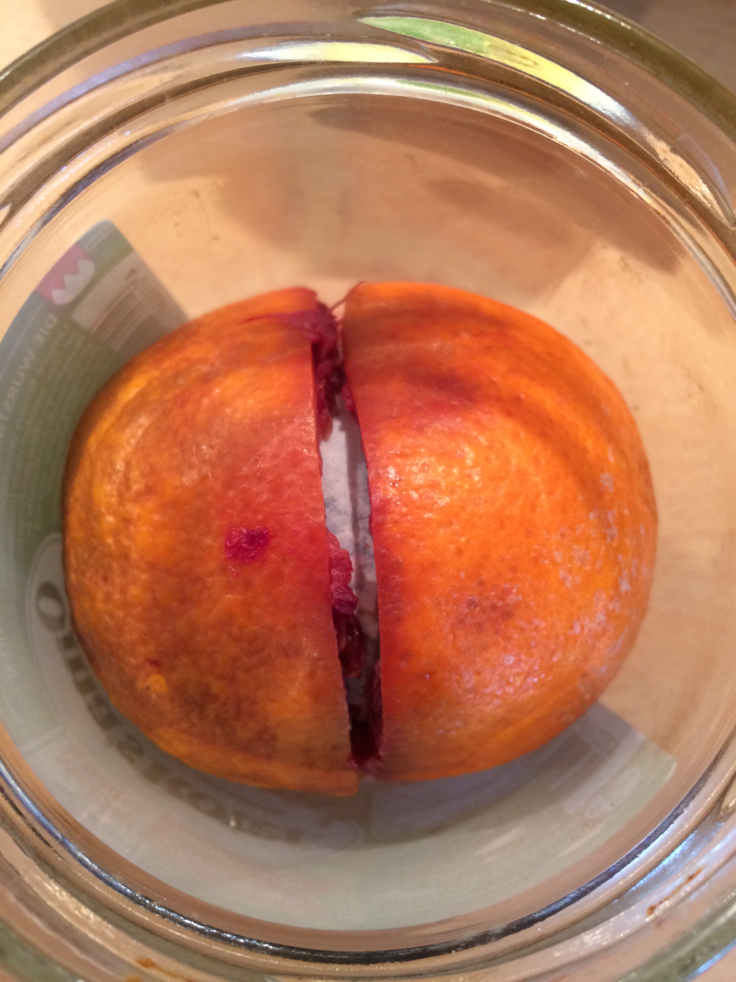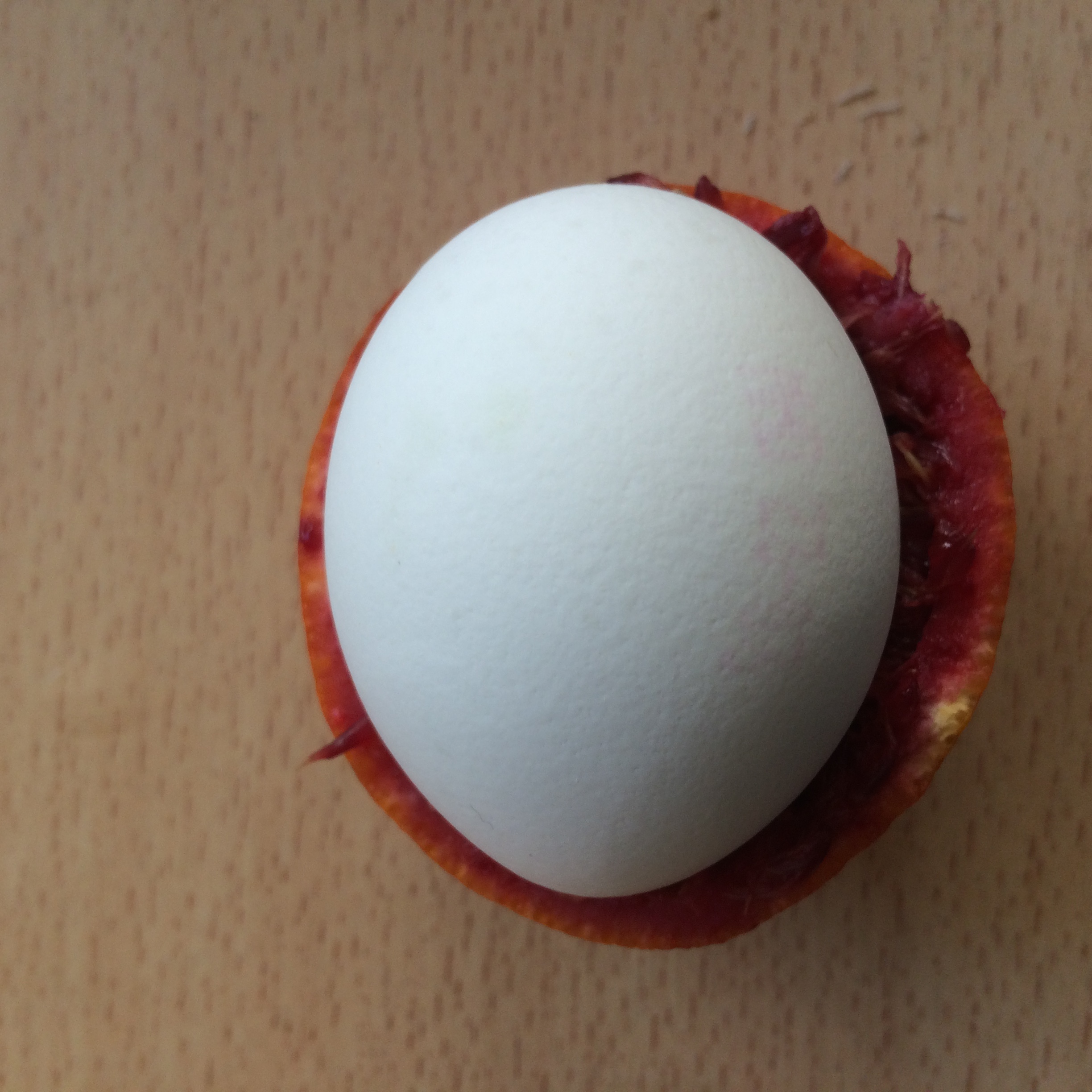 You need to place and already cooked (hard boiled) egg like a sandwich inbetween the 2 halves of the blood orange and leave it overnight in the fridge. Check the fotos below.