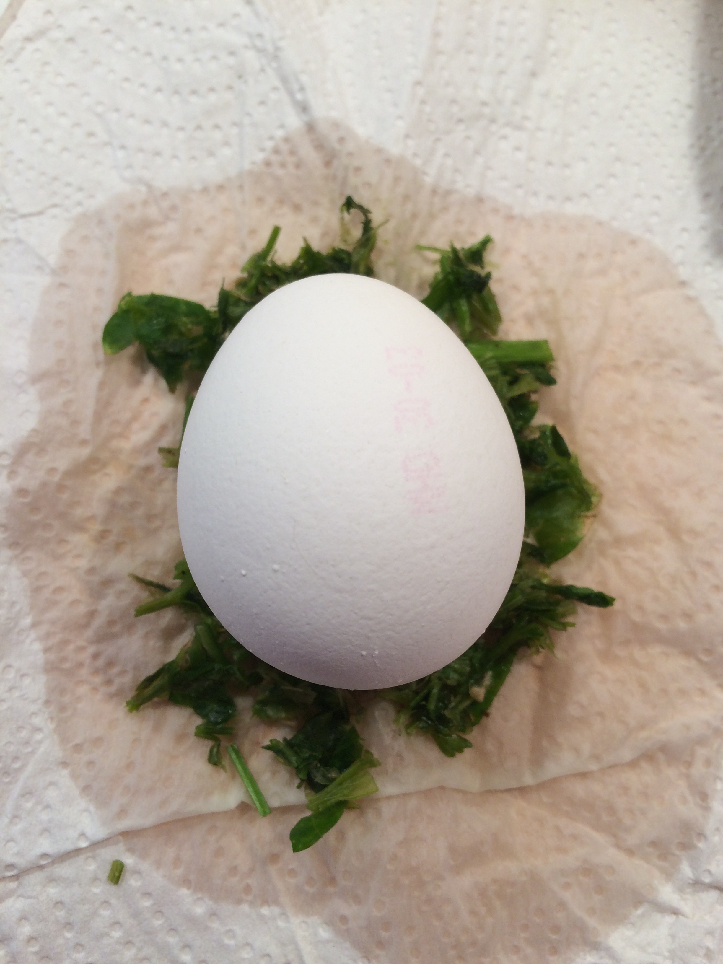 I cut the parsley is small pieces and I smash it. I put it on a napkin and afterwards I covered the egg for a day. I used a hard boiled egg and twice the napkin was not that wet anymore, so I added drops of water.