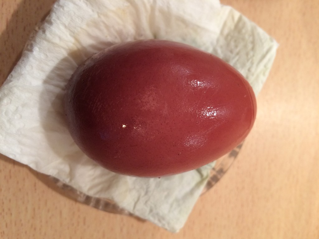 The egg was boiled for 15 minutes together with the peels, then the peels were removed and I let it sit in the juice for a day.