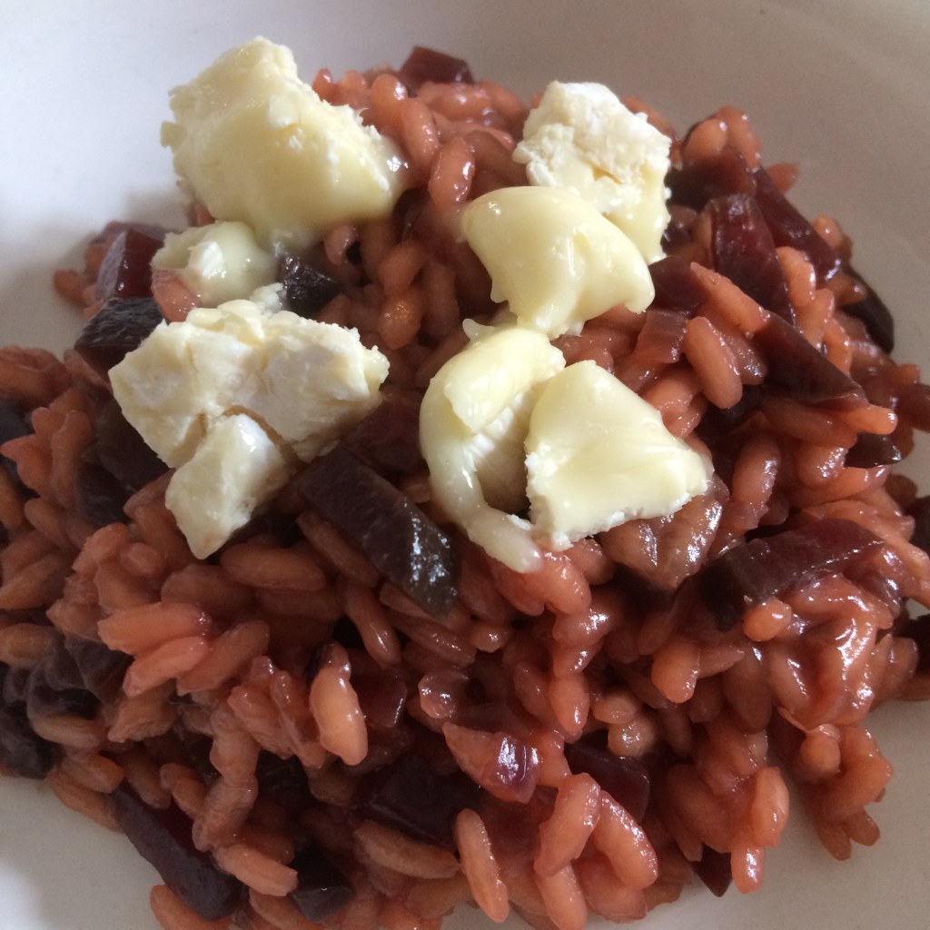 - When the rice has no liquid anymore, add the red beets together with the pieces of the herb you chose and stir well