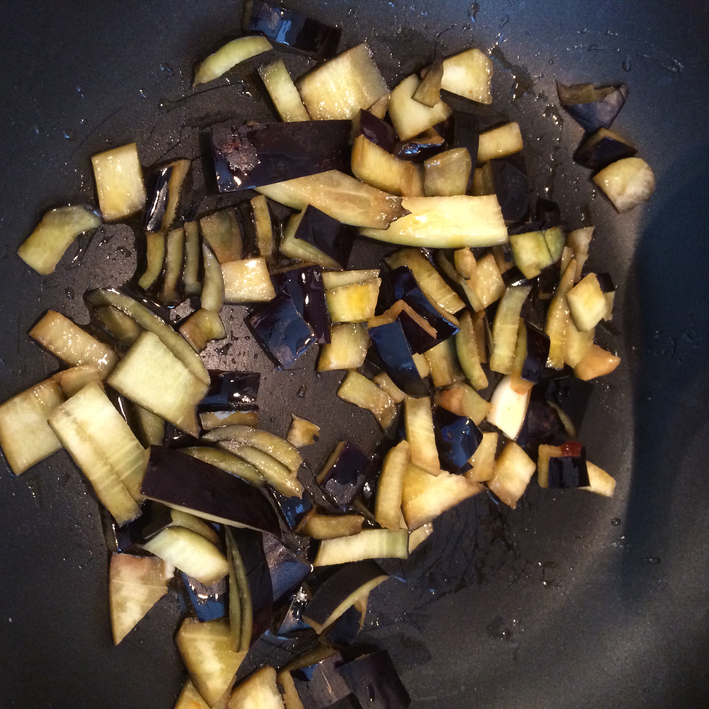 - After around a minute, add the pieces of the exterior of the aubergine and keep an eye on them