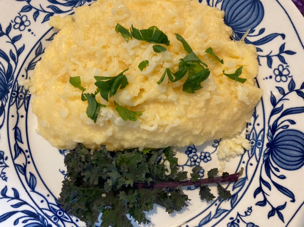 - Follow the instructions of cooking the polenta and when you turn off the fire add the cheese