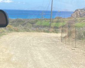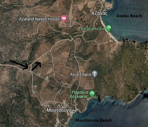 Coming down the main road of the villages direction Moutsouna, there is a sign on the left to turn left for Azalas. There starts the non asphalt road. See the last picture.