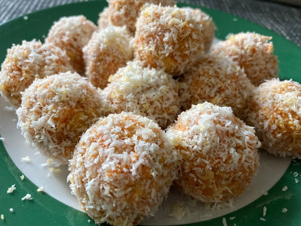 - Make the balls and before placing them in the pan, cover them with shredded coconut