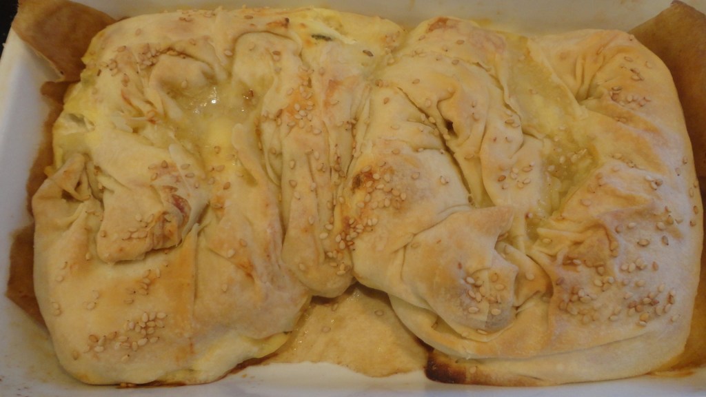 - If you followed the video or you have filo also on the upper part of the cheesepie, add some olive oil on top and some sesame if you wish