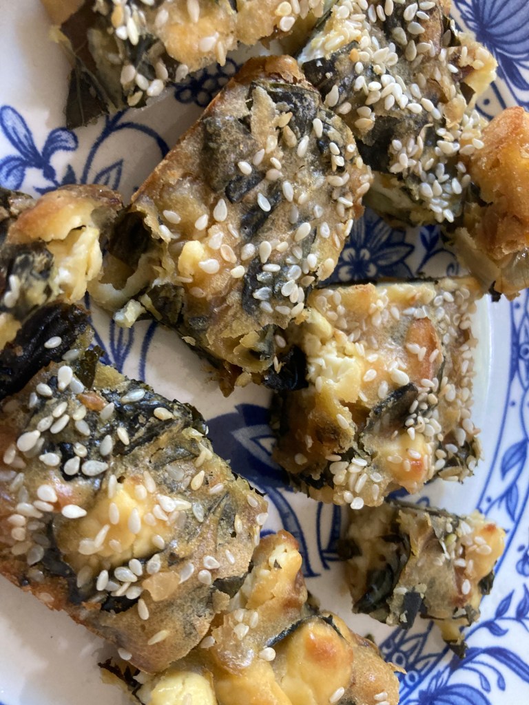 - when the onion and the kale is not anymore warm, add the feta that with you hands you make in small pieces and the eggs and mix well