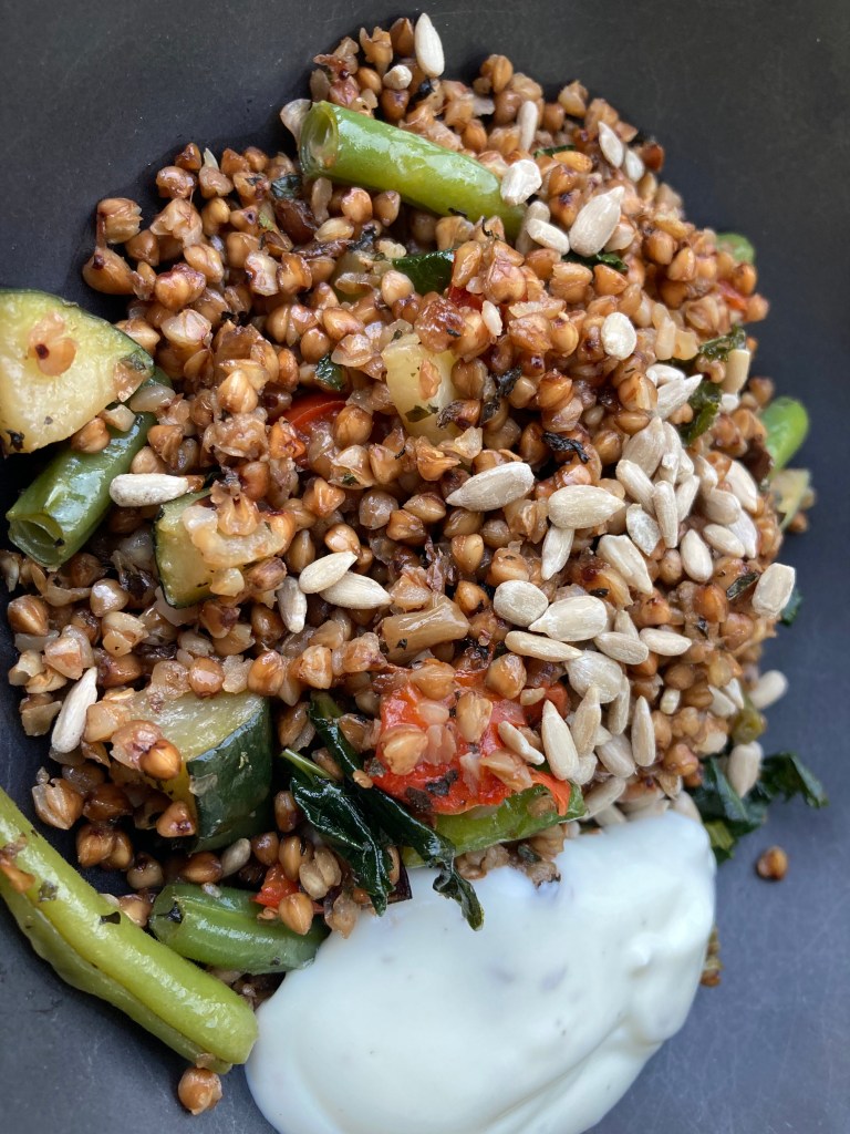 Just make a sofritto with what you have. Add the vegetables you have in your fridge, add in the end the buckwheat and cook it there, You can serve it with some seeds and yogurt!