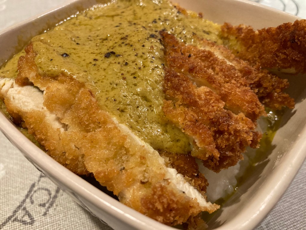 The sauce has onion (to give a bit of sweet flavour), that was prepared in olive oil in low temperature till transparent, we added a bit of flour and the curry and in the end coconut milk. Alternatively you can use a bit more flour and meat broth for the currysauce.
