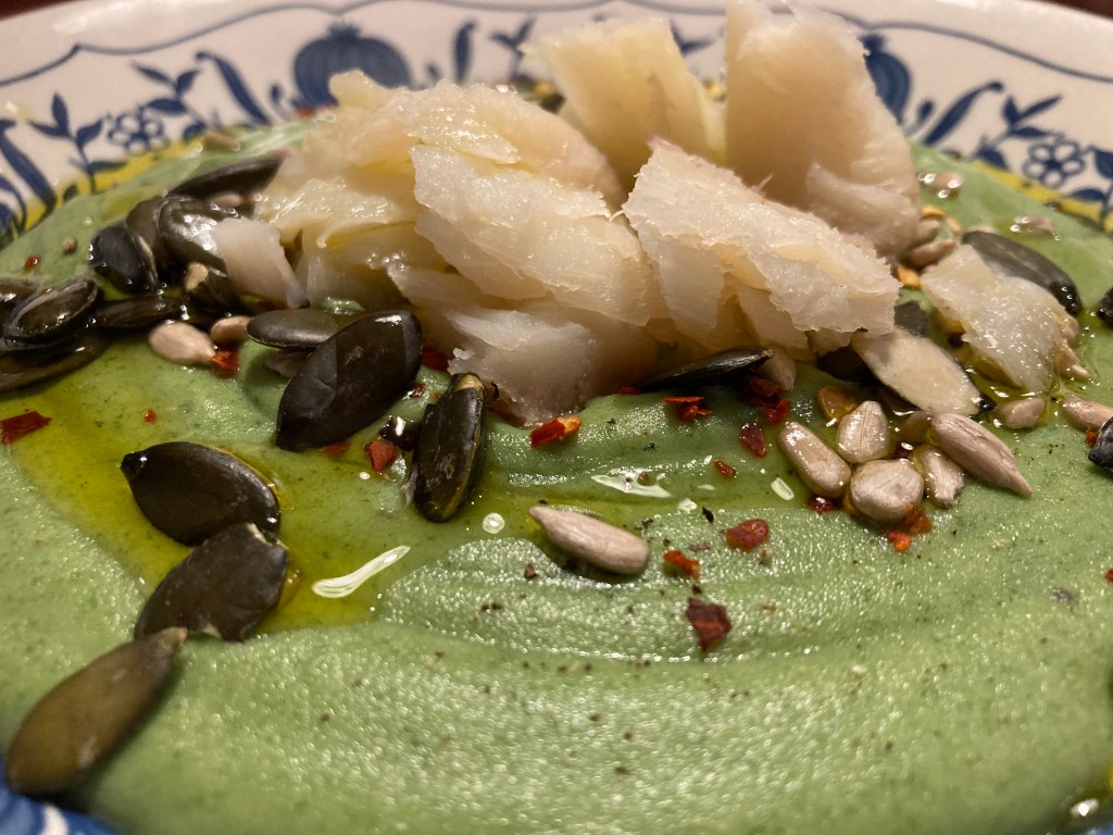 This soup has a fantastic green matte color and the fish, the seeds and the bukovo make a nice contrast.