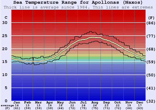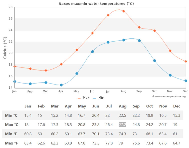 The peak of the water temperature at Naxos as you can well imagine is in August. Below you can find the average temperatures per month for Naxos but also for Apollon! So check out the Aegean sea temperatures at Naxos.