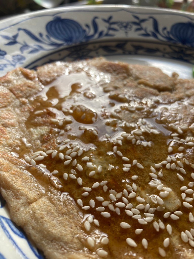 Of course the first toppings that come in mind are hazelnut paste or lemon and sugar. But what about honey and sesame? It is an amazing combination, that gives you also a funny crunchy texture.