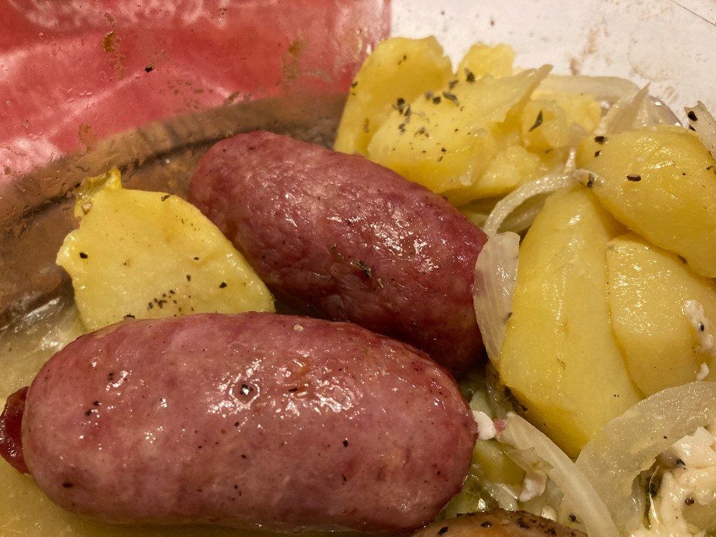 We first boil the potatoes and the onions and a bit before they are done, we put them together with the sausages in the oven.