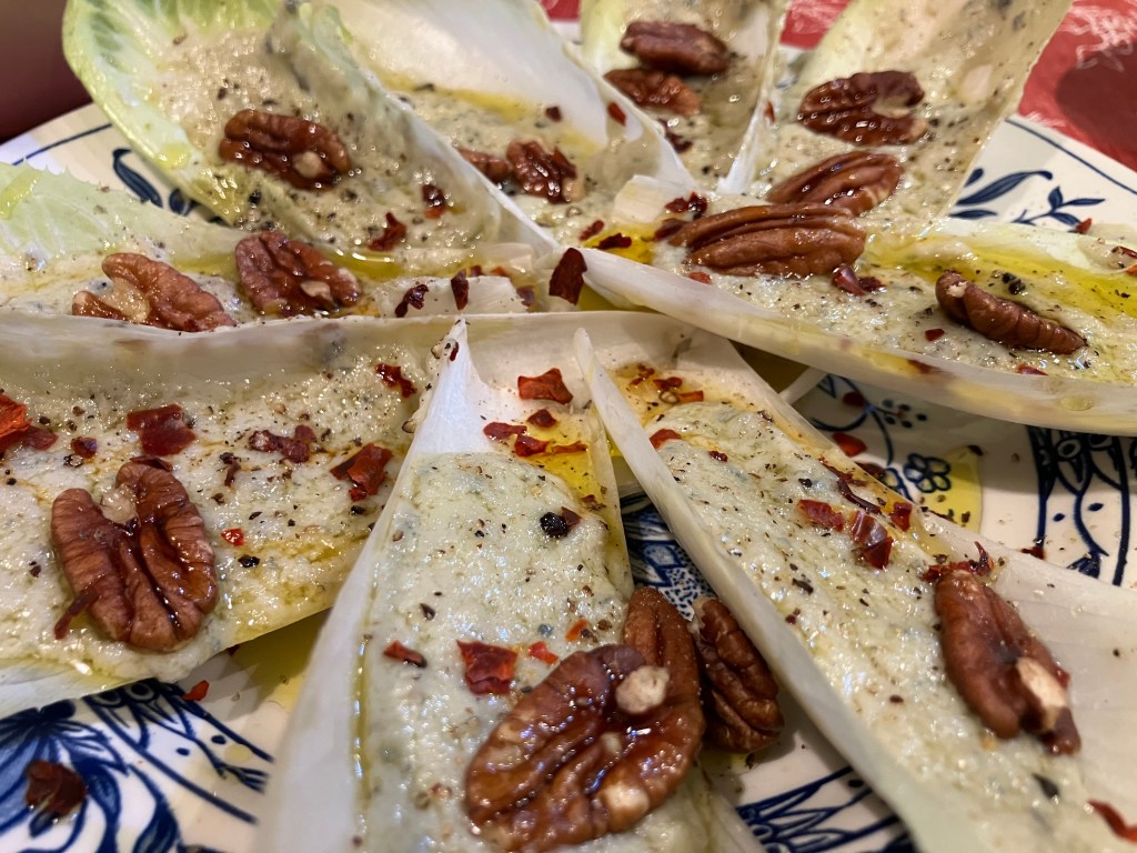 This is a quite fancy dish that you can serve as aperitivo to share. The salad part in chicoree and the filling is blue cheese and creme fresh that we warmed together. We finished with extra vergin olive oil, pecans, freshly grinded pepper and bukovo.