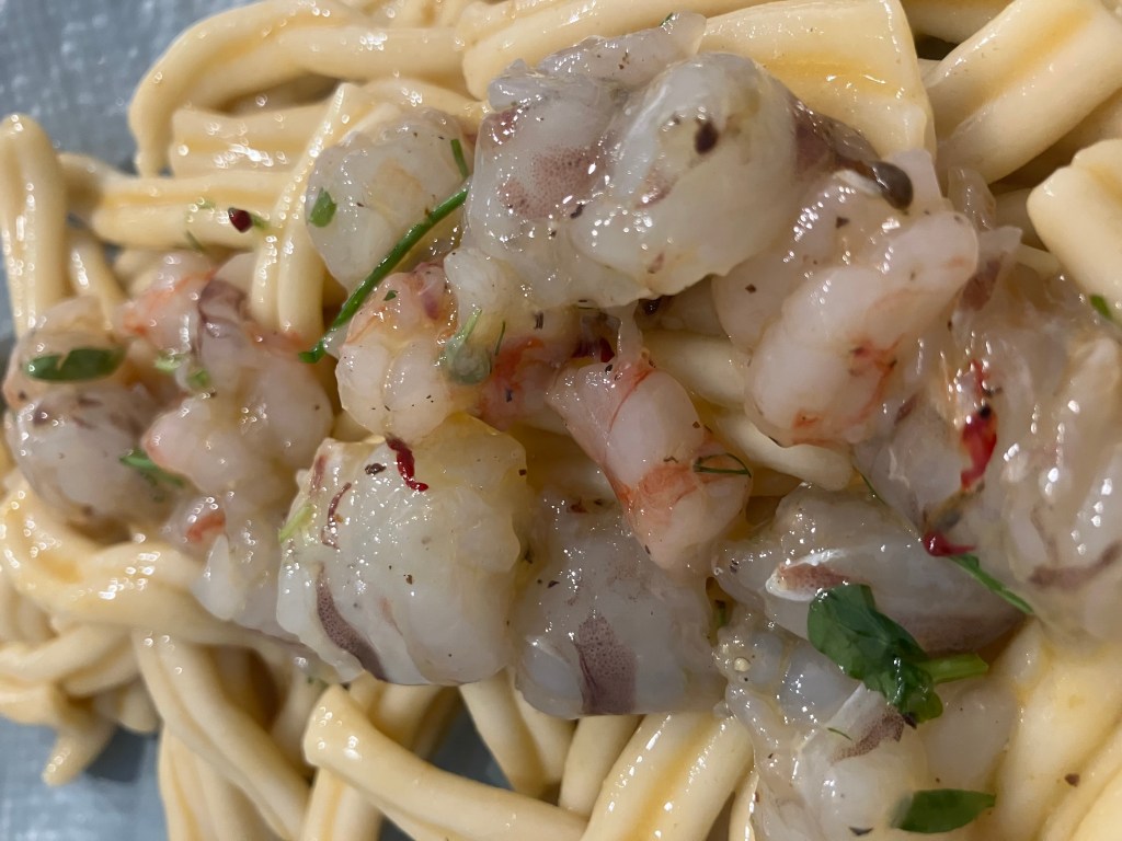 Add on top of the pasta the red shrimps tartar with a bit of olive oil.