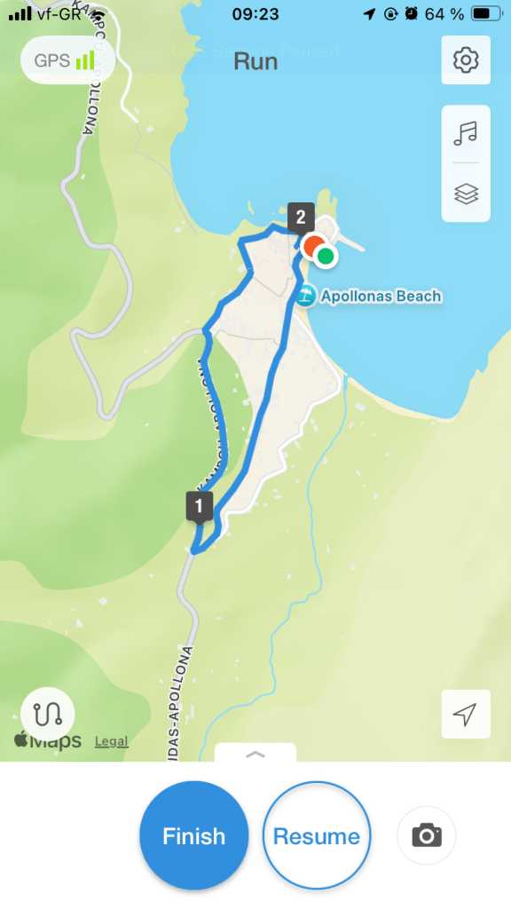 Starting at the pier of Apollon and after doing a short preparation (especially if you are not doing any exercise), just follow the street till you reach a point, that you can do a full U-turn on your right. You will find the U-turn after passing the small church and the cemetery on your left.