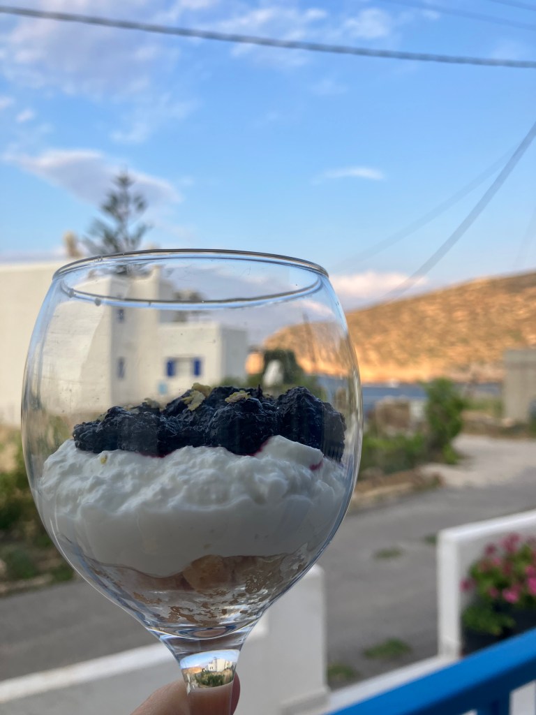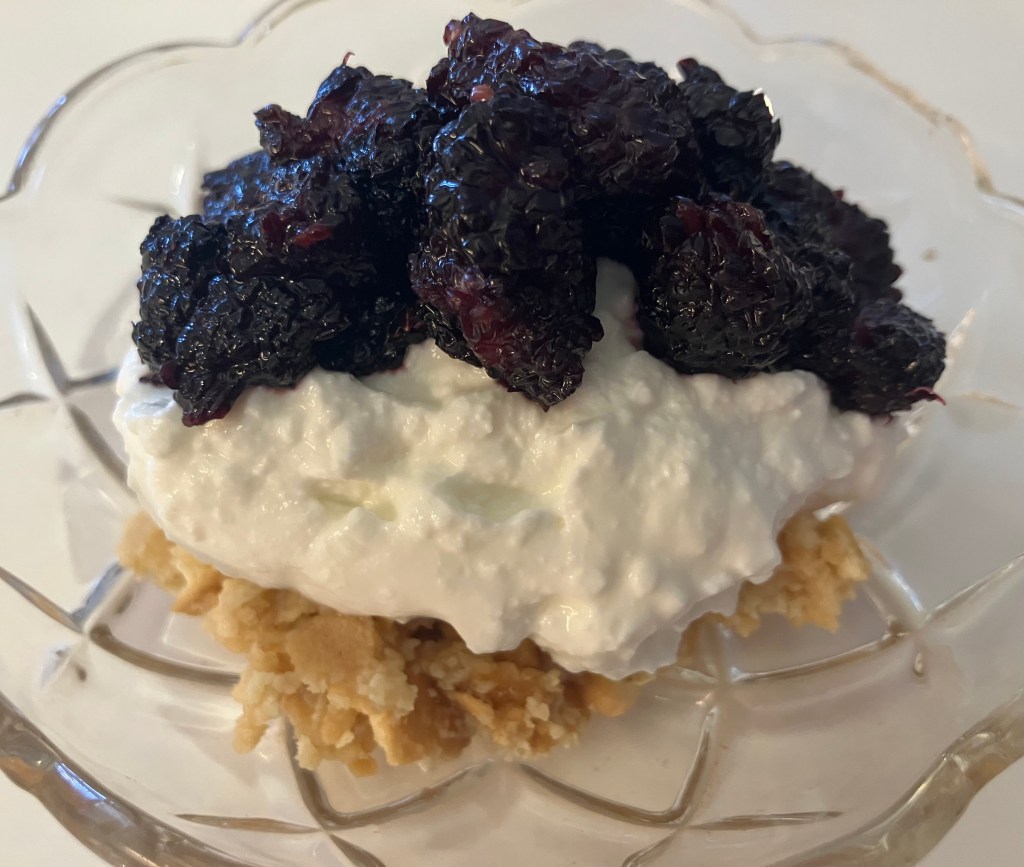 - when the mulberries are done, you can start the assembly. You could do it in a ball or a glass. First go the biscuit, then the yogurt/cheese, then the mulberries and in the end the lemon chest.