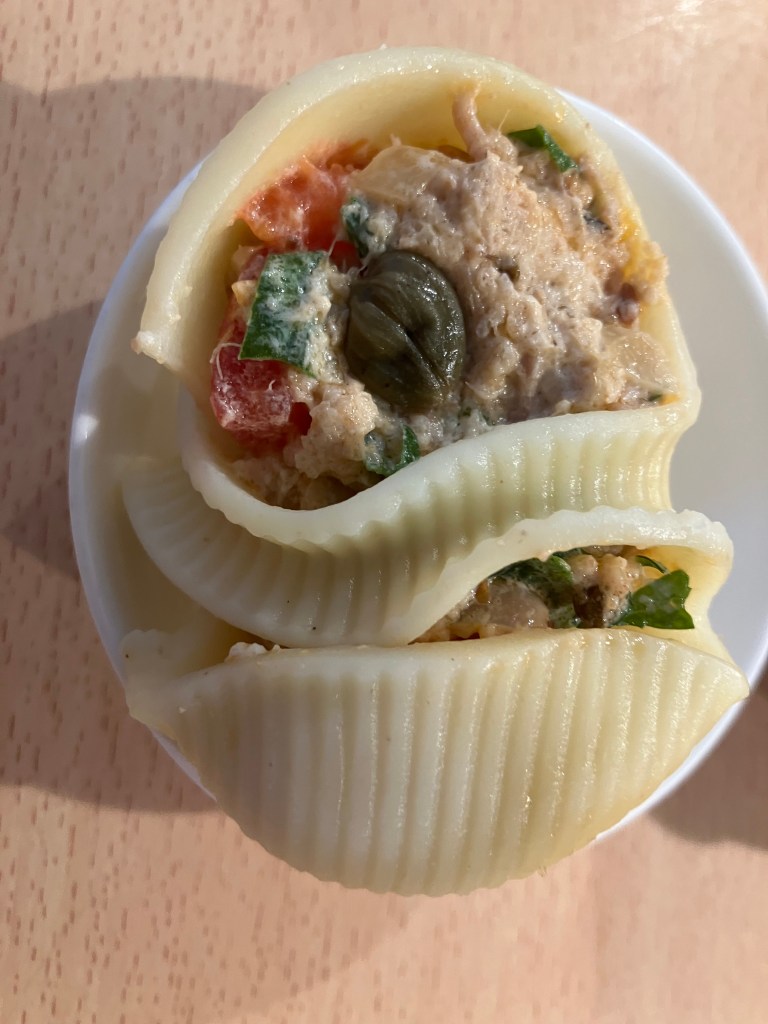- After mixing the tuna with the onion, add the creme fraiche and keep stiring. When it stops being liquid, stop the fire and remove the pan from the fire