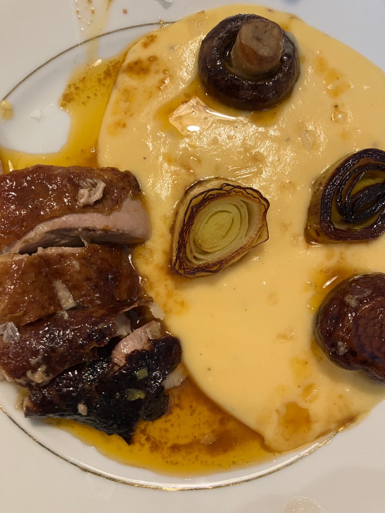 We roasted in the beginning on the stove in a cocotte the duck for like an hour and then we finished it in the oven. In the oven it was also for an hour.