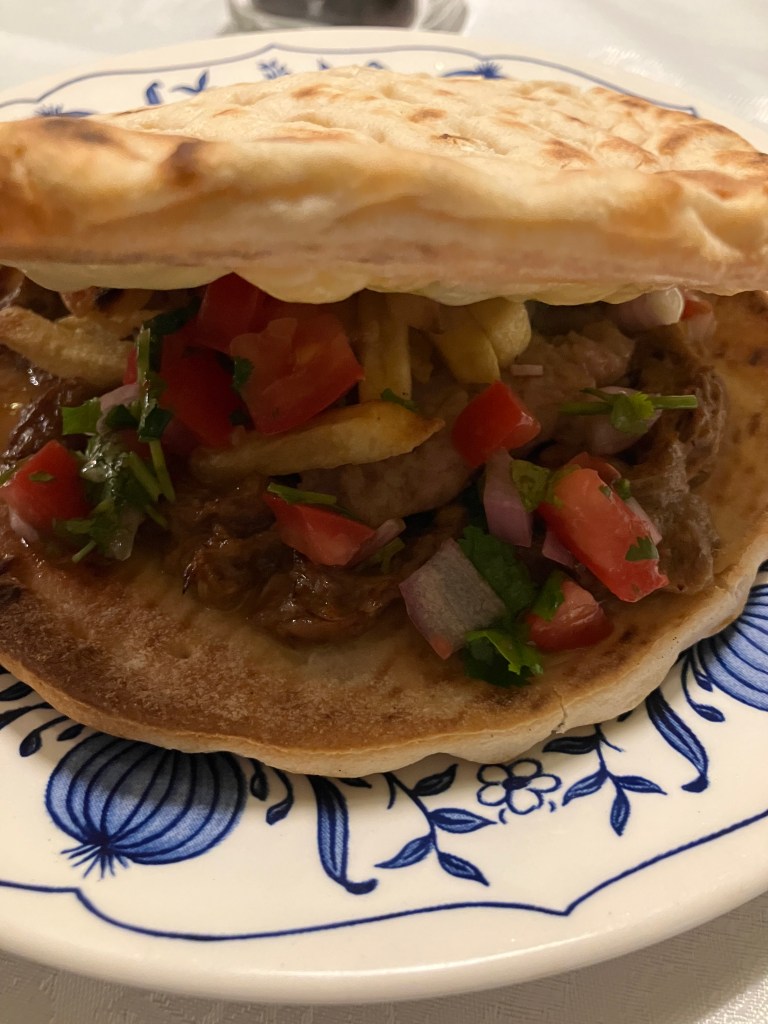The magic part is adding slices of cheese. Put the pittas in the oven shortly with the cheese on top. Add the leftover meat and the tomato and on top put another pitta with melted cheese.