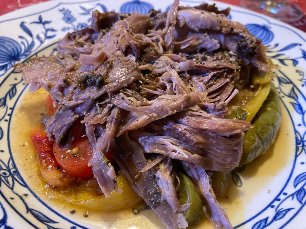 The goose was prepared in the crockpot with pork lard, a bit of rosemary, cinnamon and tomato sauce. It was cooked for 4 hours.